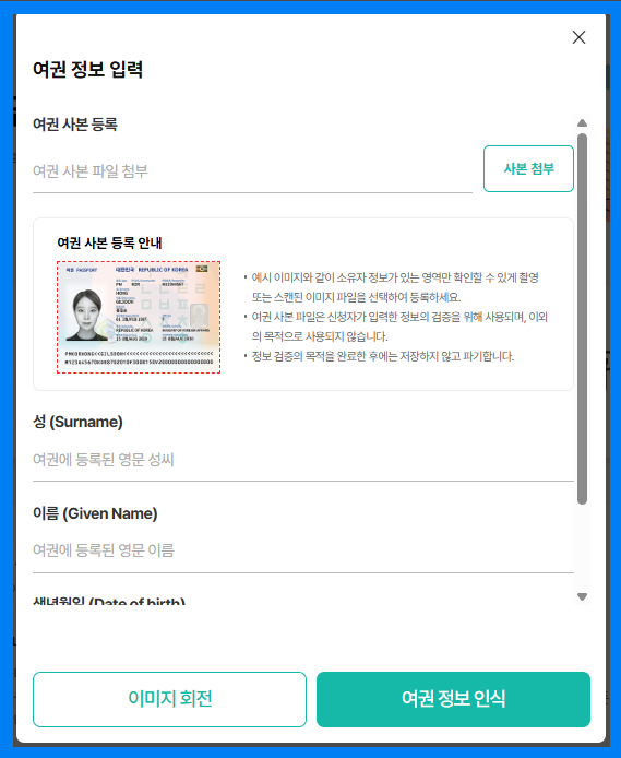 사진은 새 여권의 경우 빛이 반사되지 않도록 주의해주세요. 스캔으로 올려도 되고, 사진을 찍어 올려도 됩니다.