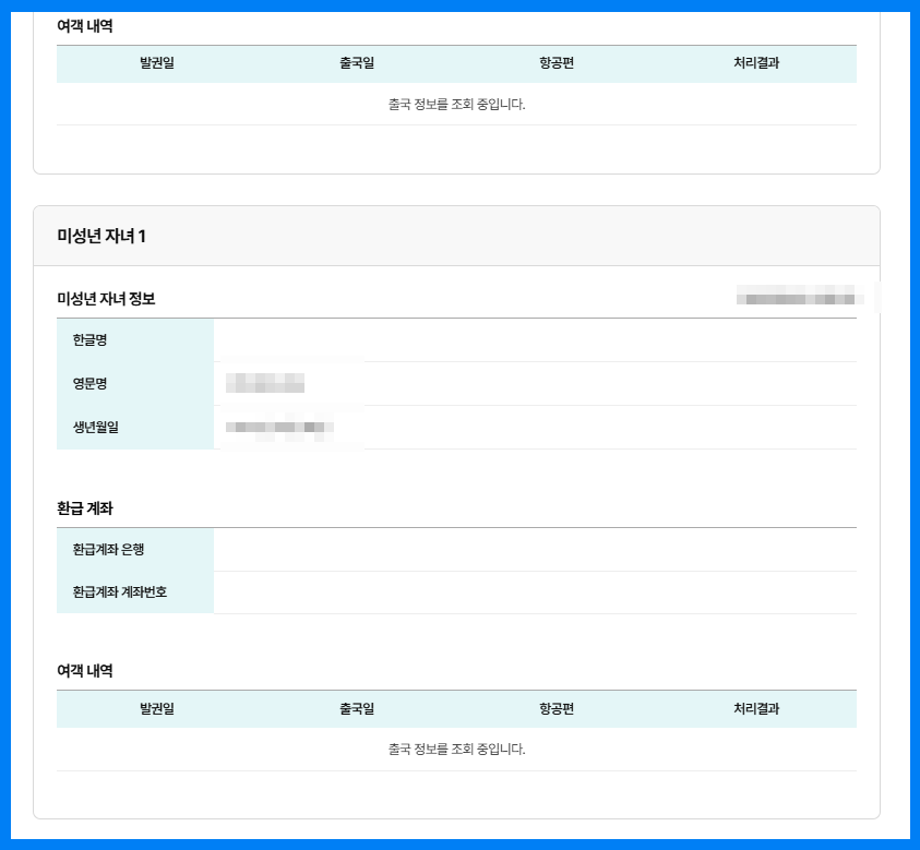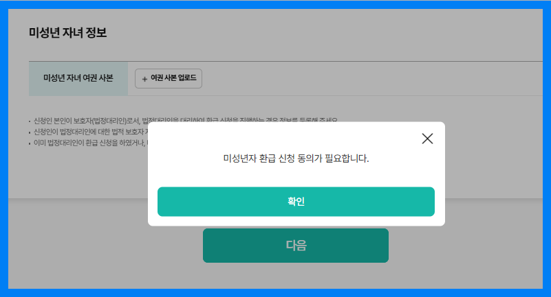 미성년자의 경우, 여권만 있으면 되며, 성인 먼저 신청 후 자녀 것을 신청하시기 바랍니다.