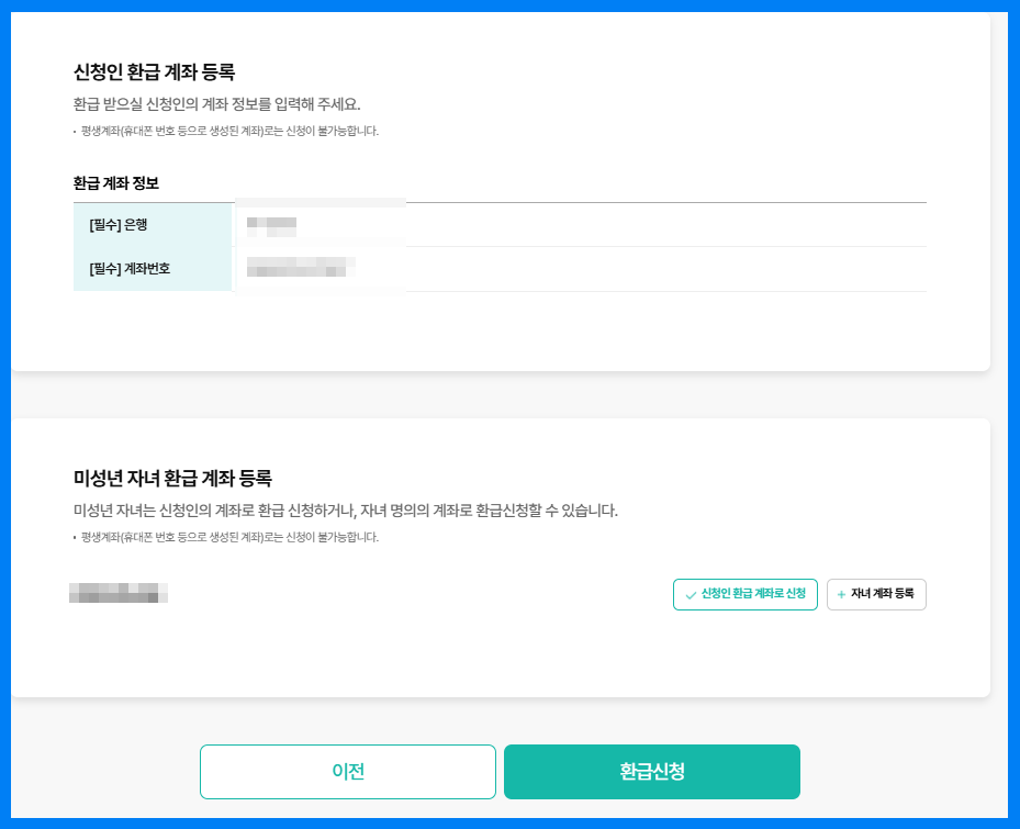 6. 환불받을 계좌를 선택합니다. 그럼 신청이 완료됩니다.