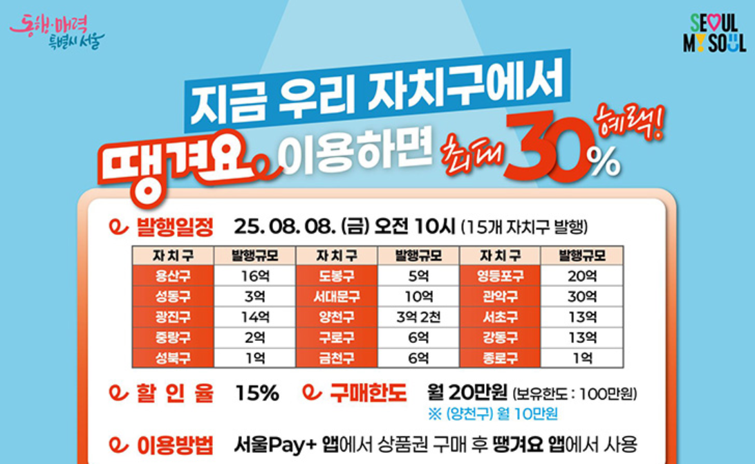 2025년 8월 8일부터 서울시민은 ‘서울페이+ 앱’에서 배달전용상품권을 15% 할인된 가격에 구매할 수 있고, ‘땡겨요 앱’을 통해 배달 음식을 주문하면서 추가 페이백과 포인트 적립까지 누릴 수 있습니다.
