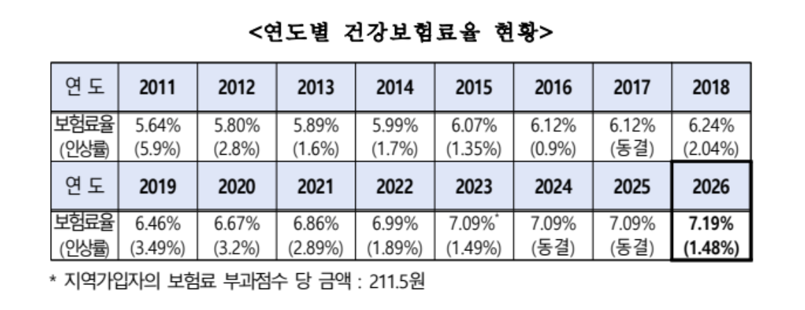 2026년 건강보험료율이 7.19%로 확정되었습니다.